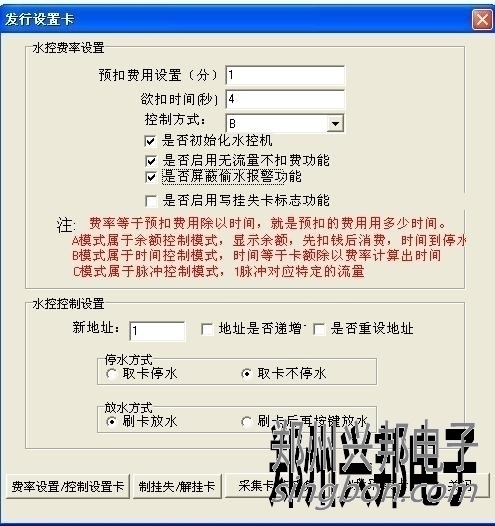 2、在水控費(fèi)率設(shè)置里面,預(yù)扣費(fèi)用設(shè)置寫1,預(yù)扣時(shí)間寫4,控制方式選擇B,按下圖來設(shè)。然后制一張費(fèi)率設(shè)置卡。
